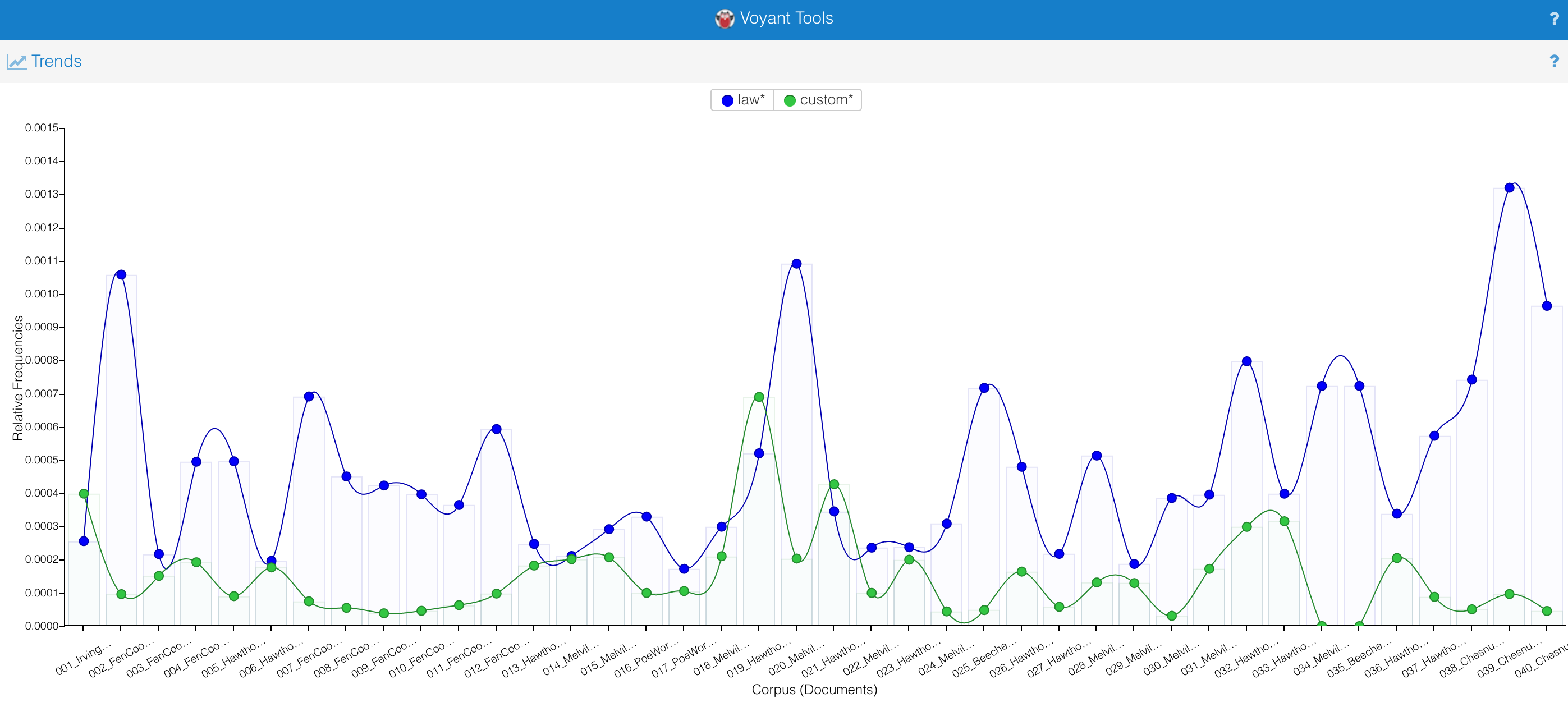 I composed a corpus of texts readily available on Project Gutenberg made up of texts by Washington Irving, Nathaniel Hawthorne, and Herman Melville, each of whom wrote custom sketches to one degree or another. I also added texts by James Fenimore Cooper, Edgar Allan Poe, and Harriet Beecher Stowe. The last and later author was Charles Chesnutt, an African-American writer who wrote at the end of the 19th century but whose work often alludes to the custom sketch. I ran this corpus through two text mining tools, Voyant and AntConc, as well as MALLET, a machine learning application that can apply statistical techniques to texts that are used to generate topics (i.e., words that seem to have a statistical relationship to each other across a text or set of texts). With Voyant and AntConc, I searched for words and terms that I thought might help me establish a relationship between custom and the law. Initially, I meant to use MALLET to see if it would generate topics around custom and/or the law. In a way, my intent was to “validate” my findings independent of my targeted searches. MALLET did not return topics that seemed to be related to custom and/or the law, but it helped me identify other terms that I could use in my targeted searches. While I searched for a good number of words that seem related to custom and/or the law, in this essay I focus primarily on the results I obtained based on the words custom, law, manner, and character (the last two words suggested by MALLET). My results were decidedly mixed, and here I must acknowledge that, at first, I thought they were inconclusive or null. That’s because my first pass at these texts was, again, very naïve. For example, because Project Gutenberg provides good quality (.txt) files for many literary works in the public domain, I assumed that I did not need to if not clean then consider the data more carefully. Specifically, while I was searching for the word “law” in the corpus, I did not think to remove the legal copyright information at the beginning of each text file. Not removing that information produced some false positives. Nor did I carefully look at every text file to guarantee that the text(s) I assumed was in the file was actually there. Deep into my analysis, I discovered that I had mislabeled Herman Melville’s Omoo as The Piazza Tales and had not in fact downloaded The Piazza Tales. Though a simple error, it was a grave one as many of the texts in The Piazza Tales are custom sketches. When I realized my mistake, I incorporated the collection of short stories and removed “Bartleby, the Scrivener” since that short story is included in The Piazza Tales. Moreover, in my first pass, I took for granted that my research question and hypothesis regarding the waning of custom and the rise of the law was fundamentally about a development through time (i.e., across the 19th century; from 1800 to 1900). When I analyzed the texts with the digital tools, I did not put them in chronological order so that while the corpus could still address the question of the prominence of the terms in the 19th century, there was no way to map the word frequencies across time. In effect, I did not optimize my dataset to answer the question I was asking. In my second pass, I put the texts in order by labeling in the following format: “001_authtitle.txt,” where 001 corresponded to the earliest published text and 040 to the text published last.