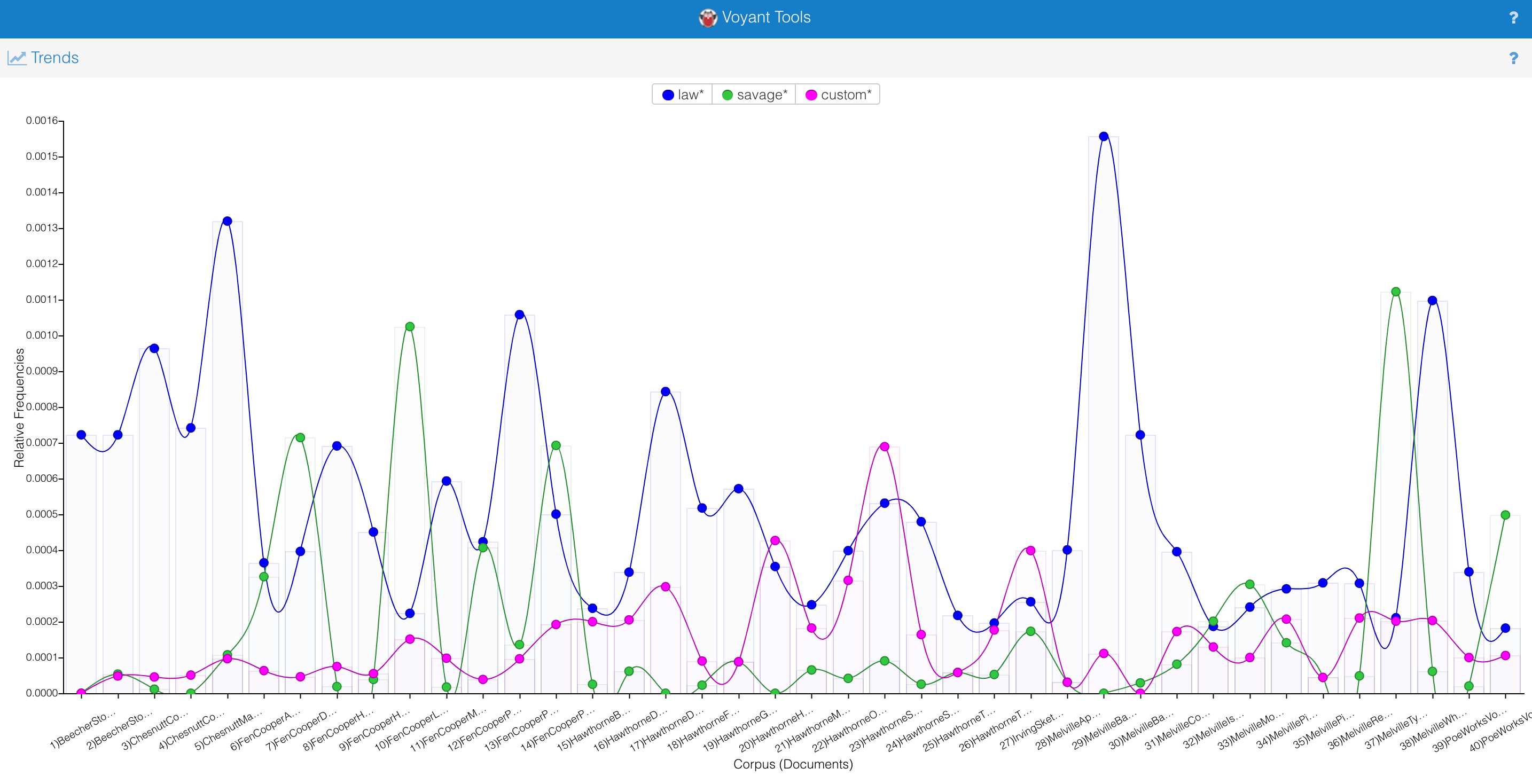 Comparing the two images above, it seems clear that while Voyant is correctly identifying relative frequency of the three terms, that’s all it’s doing (all it can do). Figure 1, unsurprisingly, looks like statistical noise. However, figure 2 should give us pause about wholly dismissing a trend: while there is variation in the frequency in which both “law” and “custom” appear in these texts, there seems to be an increase in the use of “law” in terms of absolute value and a decrease in the use of “custom.” To be sure, there seems to be a good deal of usage of “law” in the beginning of the 19th century, but most of the usage occurs in the texts of James Fenimore Cooper. A factor here may be that Fenimore Cooper might have been particularly interested in the law, but putting that speculation aside, Fenimore Cooper was a prolific writer actively publishing from the 1820s through the 1840s, while most of the other texts in the corpus were published between the 1840s and 1850s. The sheer amount of Fenimore Cooper’s writing, then, could be skewing the results for “law” so that it seems more prominent early on. It would be interesting to assign standardized weights by author, akin to the use of z scores, to see whether the graph would look the same or a more generalized trend would emerge.
