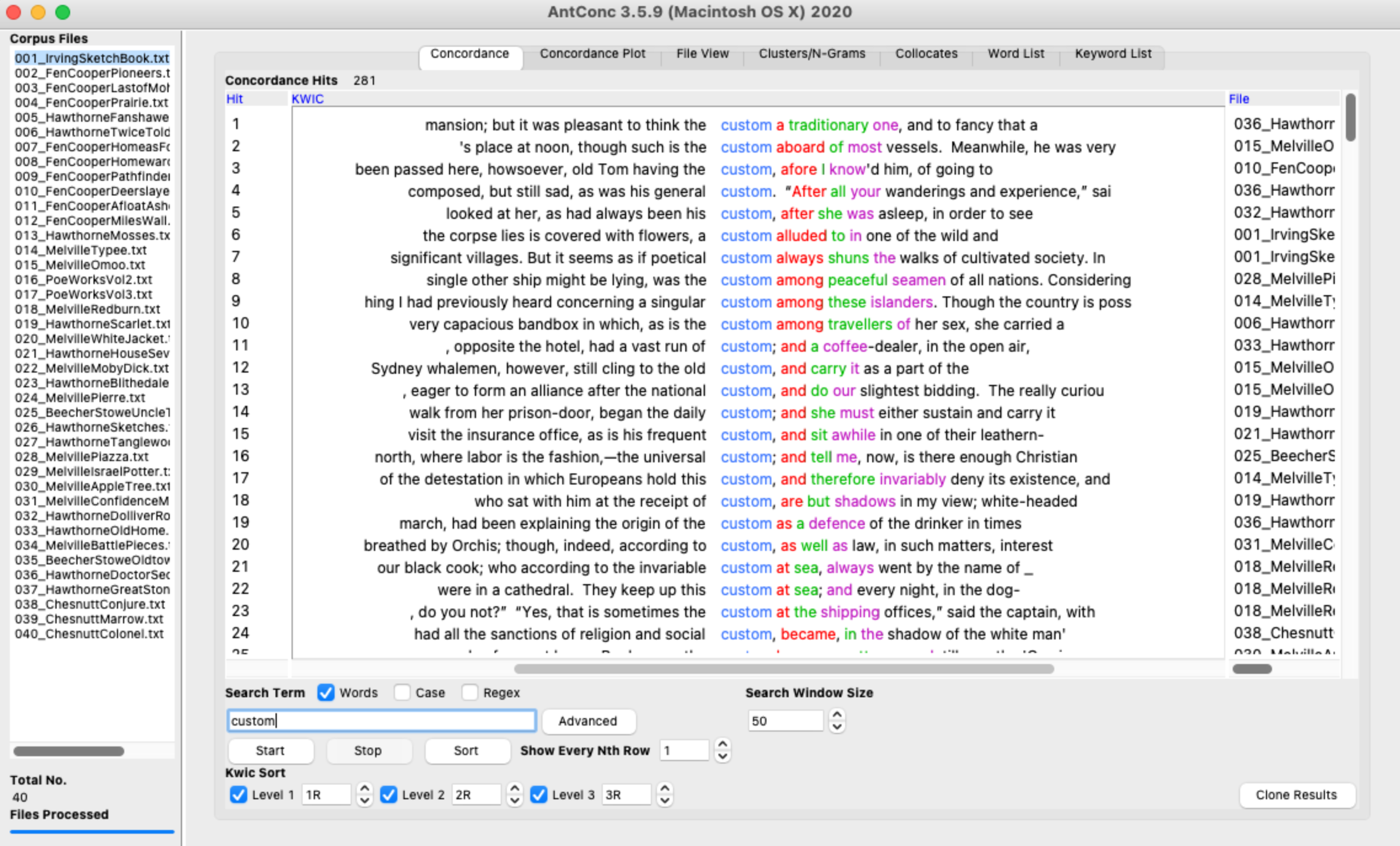 My attempt to use these tools is illustrative of methodological and theoretical issues pertaining to the specifics of this project as well as larger questions of the role of the digital humanities. In order to obtain truly significant findings, to either reject or fail to reject the null hypothesis, I would have to make significant modifications to the framework of this study. First, while the meaning of “custom” and “law” seem self-evident, it does not follow that these terms themselves would be used in fiction to refer to custom and the law, respectively. That is, the use of the word “custom” is not a necessary marker of the custom sketch. Nor is the use of the term law clear evidence of the rise of the law, though its meaning is more restricted, and an analysis in AntConc shows that we can more readily trust the usage of law as we mean it than the usage of custom.